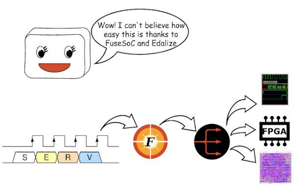 "This tutorial will show we can take an existing building block, in this case SERV, turn it into an ASIC Application Specific Integrated Circuit-friendly SoC, run it in simulation, make an FPGA prototype and finally have it manufactured as an ASIC," Olof writes. "All using FuseSoC and Edalize to hide most of the differences between these vastly different tool environments.